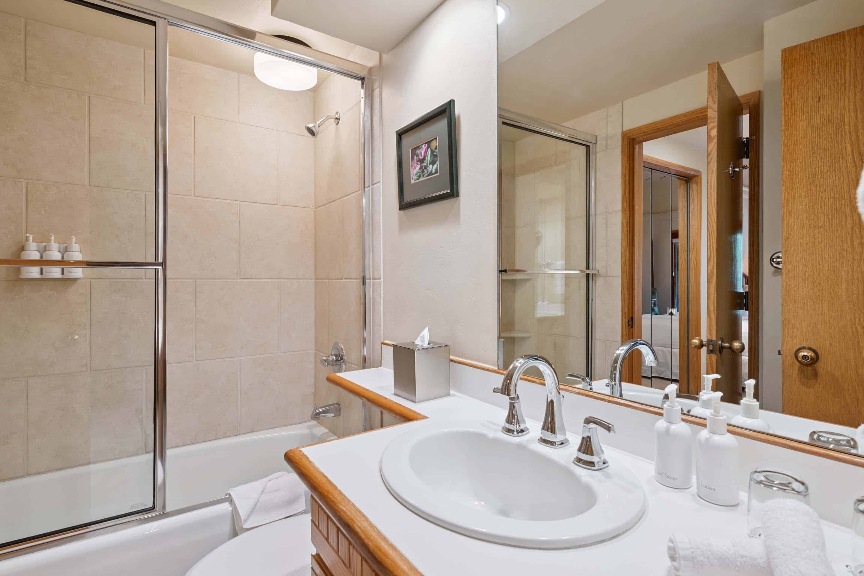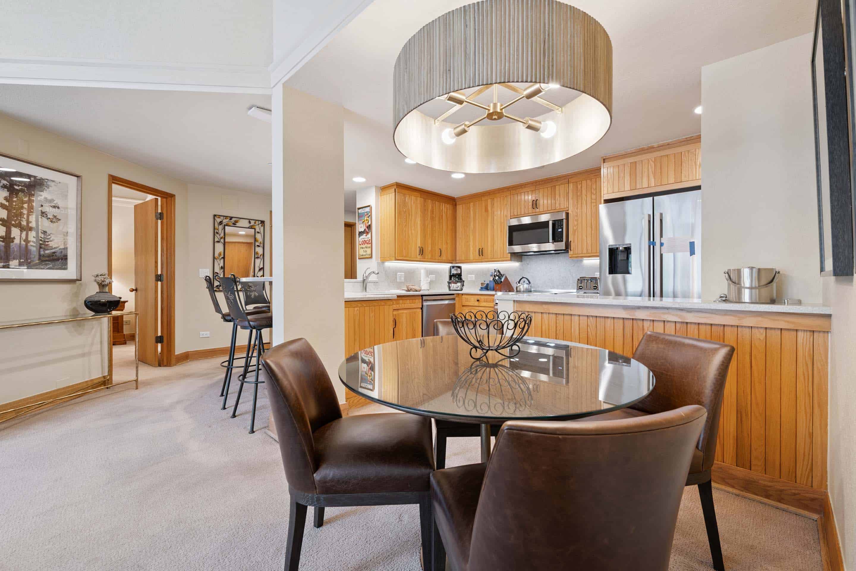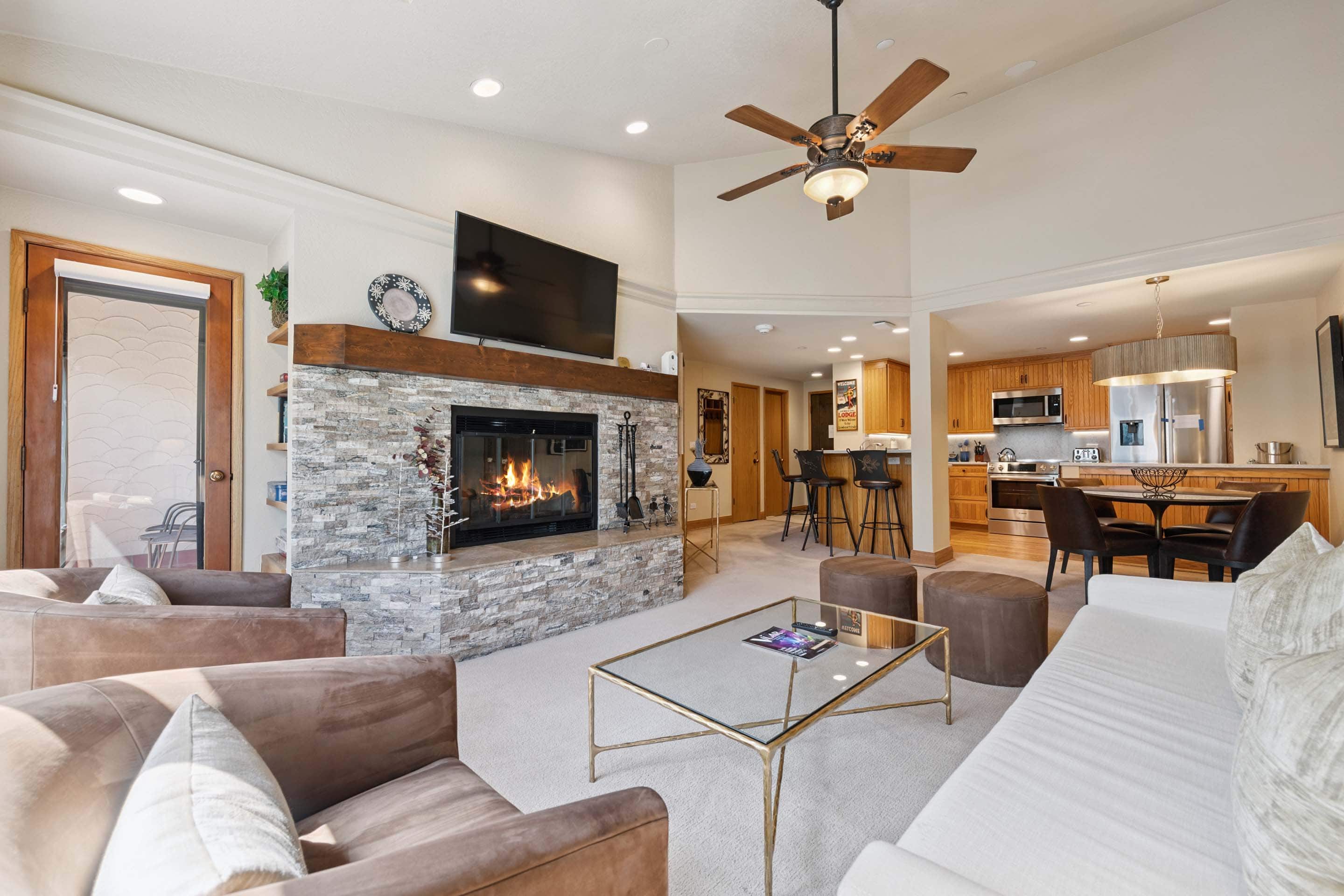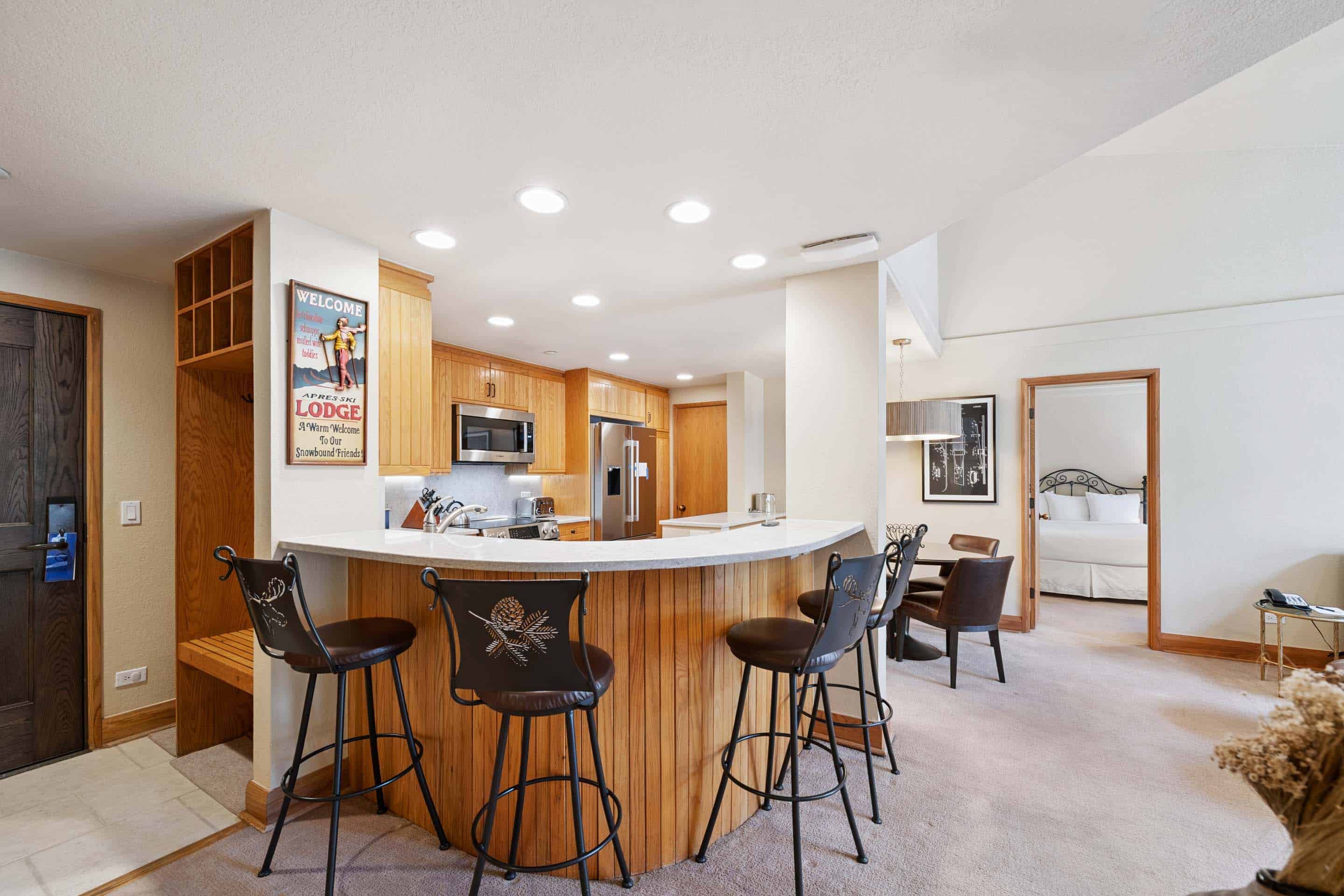 This ski-in, ski-out, two-bedroom residence sleeps eight, offering a family room with vaulted ceilings, a sleeper sofa, full kitchen, and dining niche. Additional features include two guest suites, each with an attached bathroom (one with a king size bed, the second with two queen beds), a private deck, washer/dryer and garage parking.
