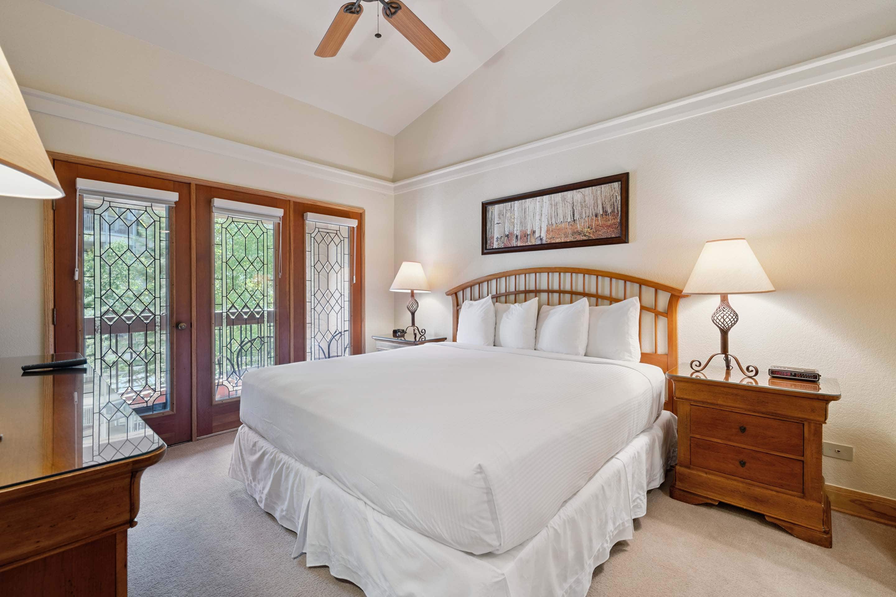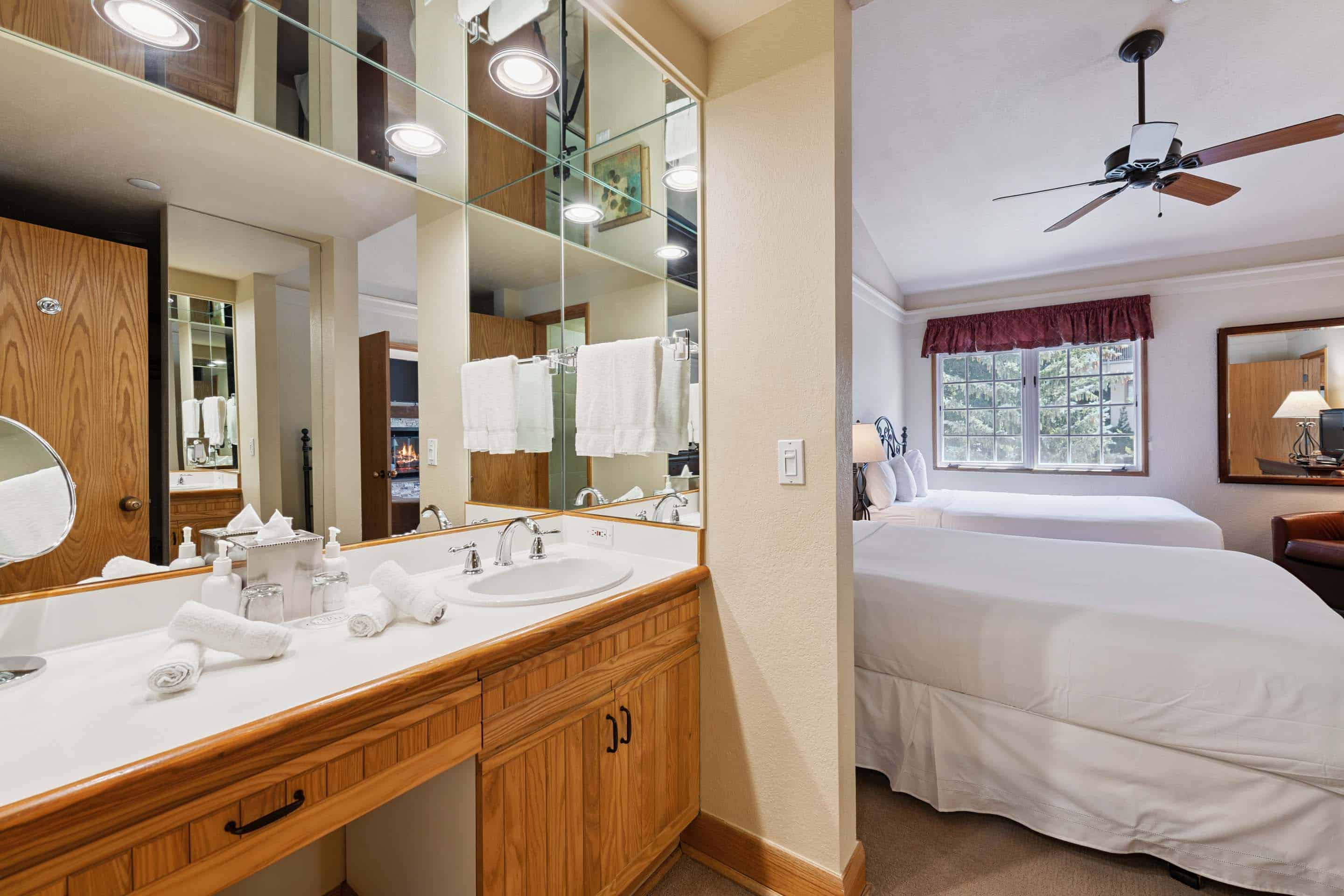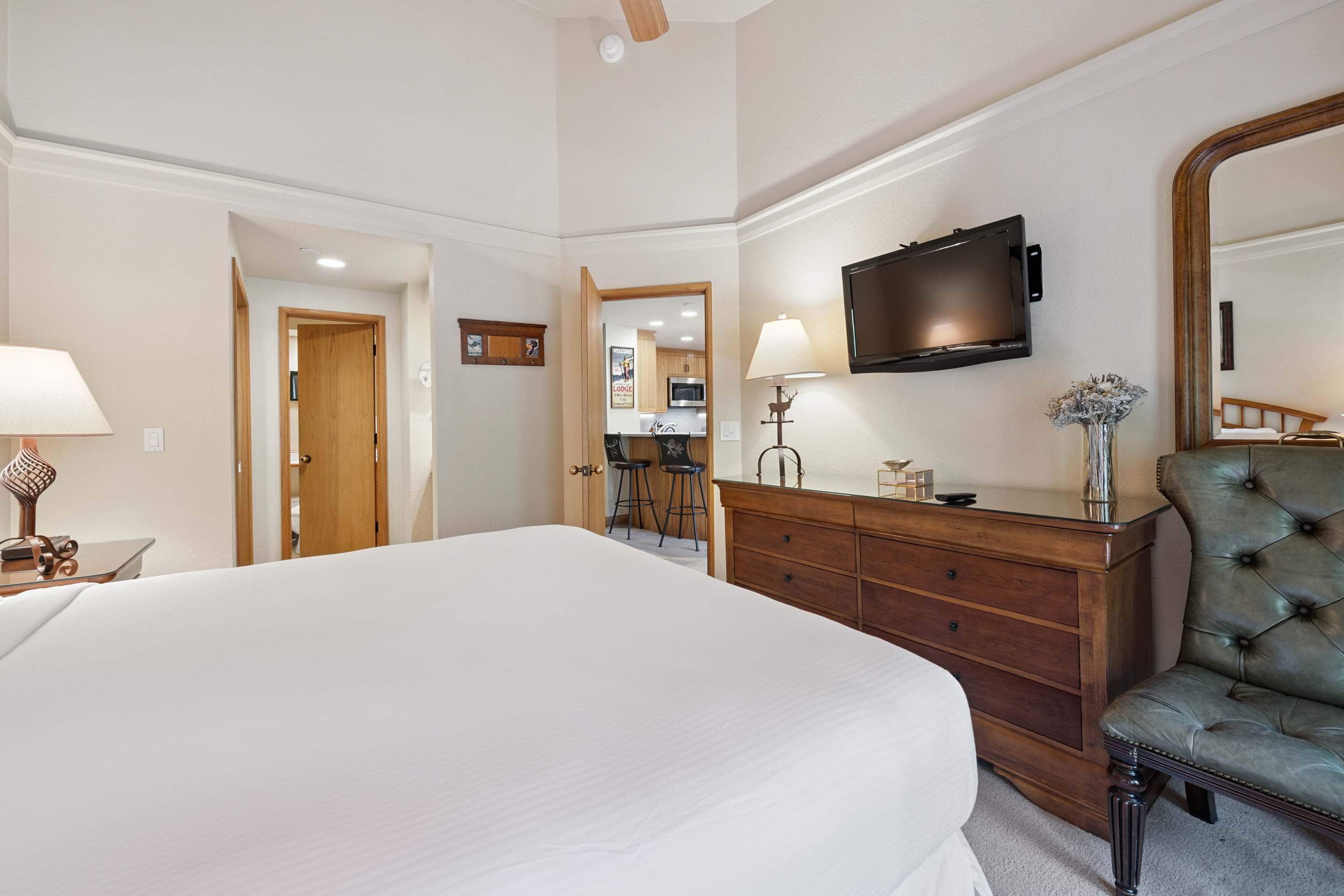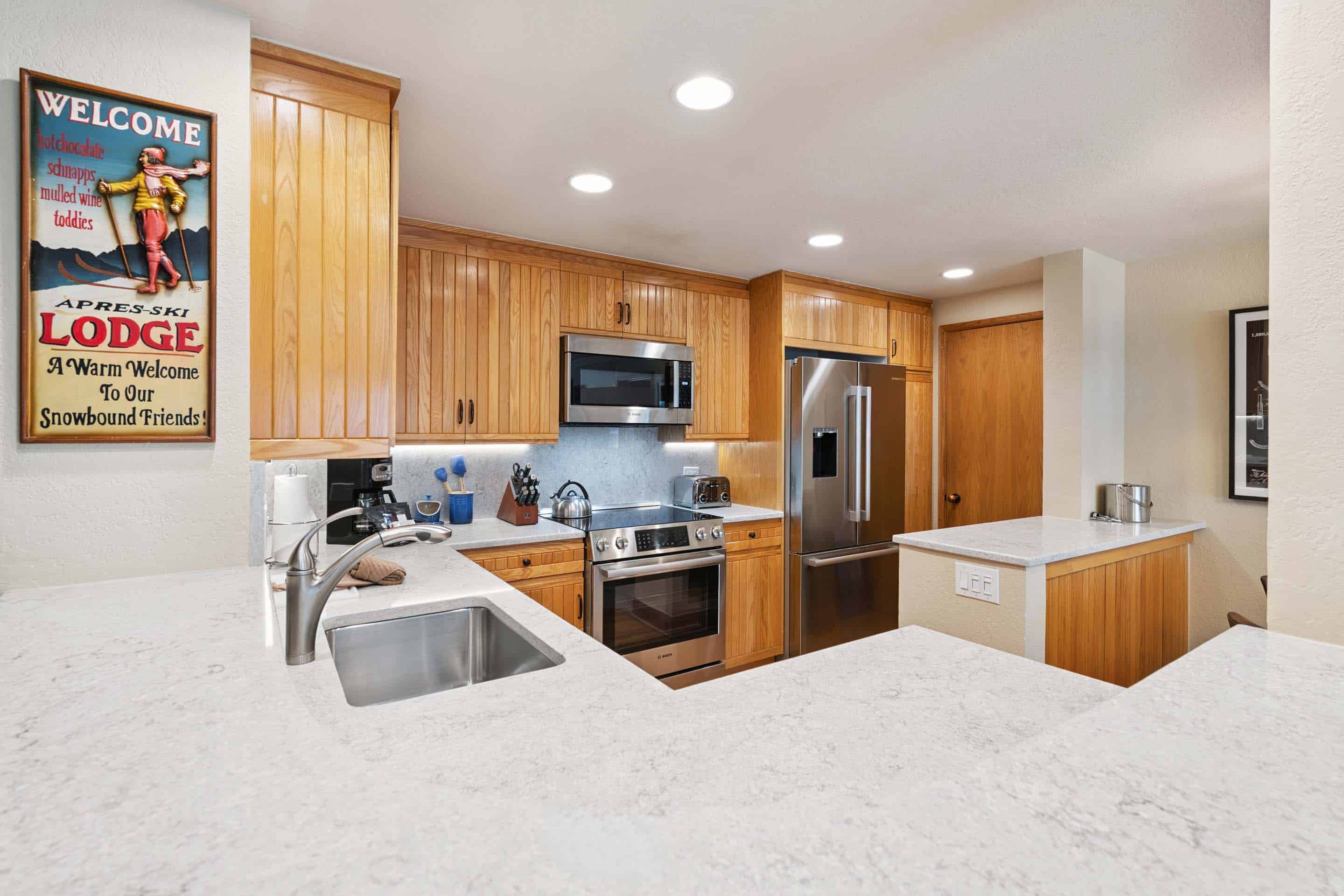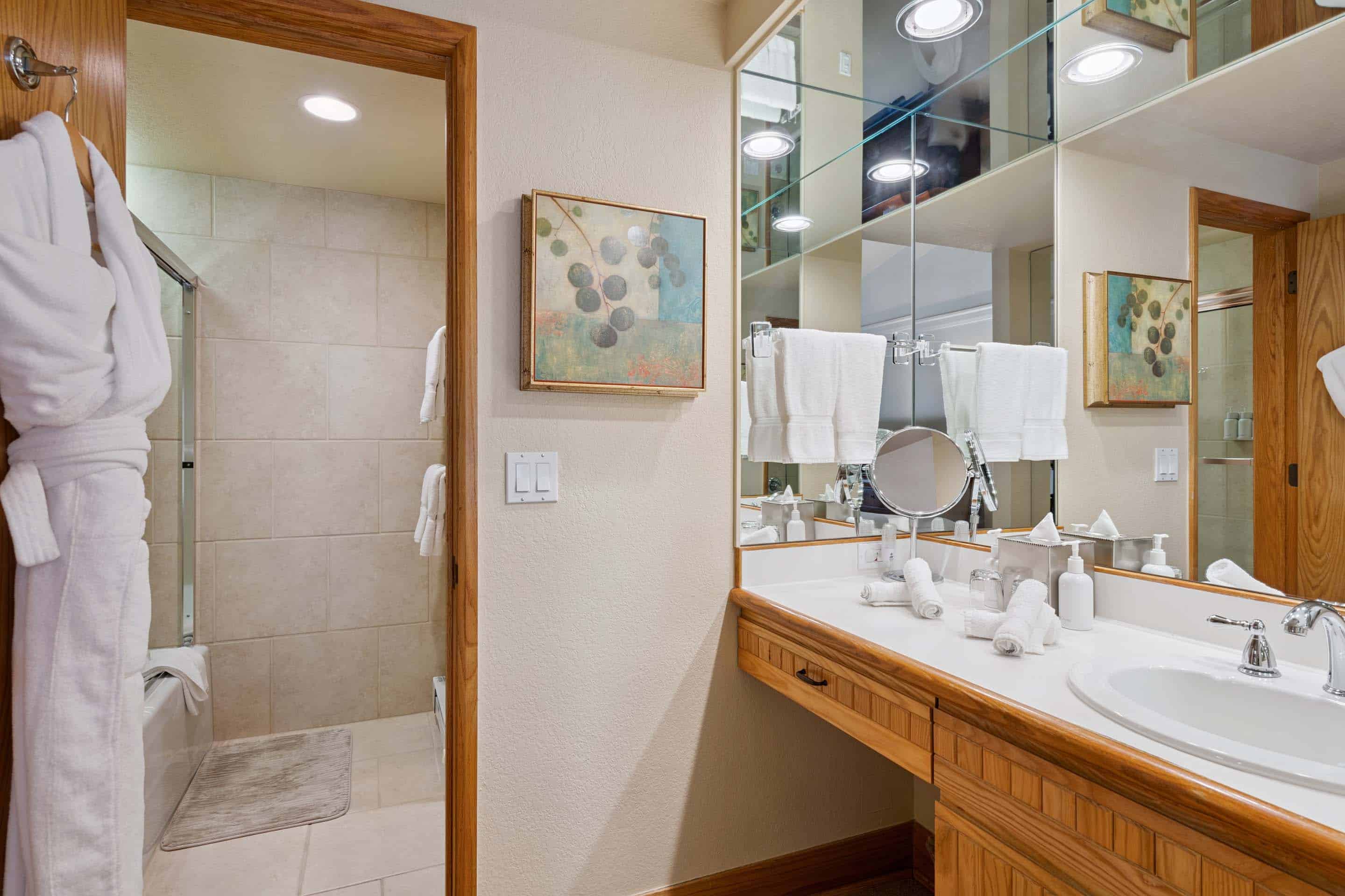 This ski-in, ski-out, two-bedroom residence sleeps eight, offering a family room with vaulted ceilings, a sleeper sofa, full kitchen, and dining niche. Additional features include two guest suites, each with an attached bathroom (one with a king size bed, the second with two queen beds), a private deck, washer/dryer and garage parking.
