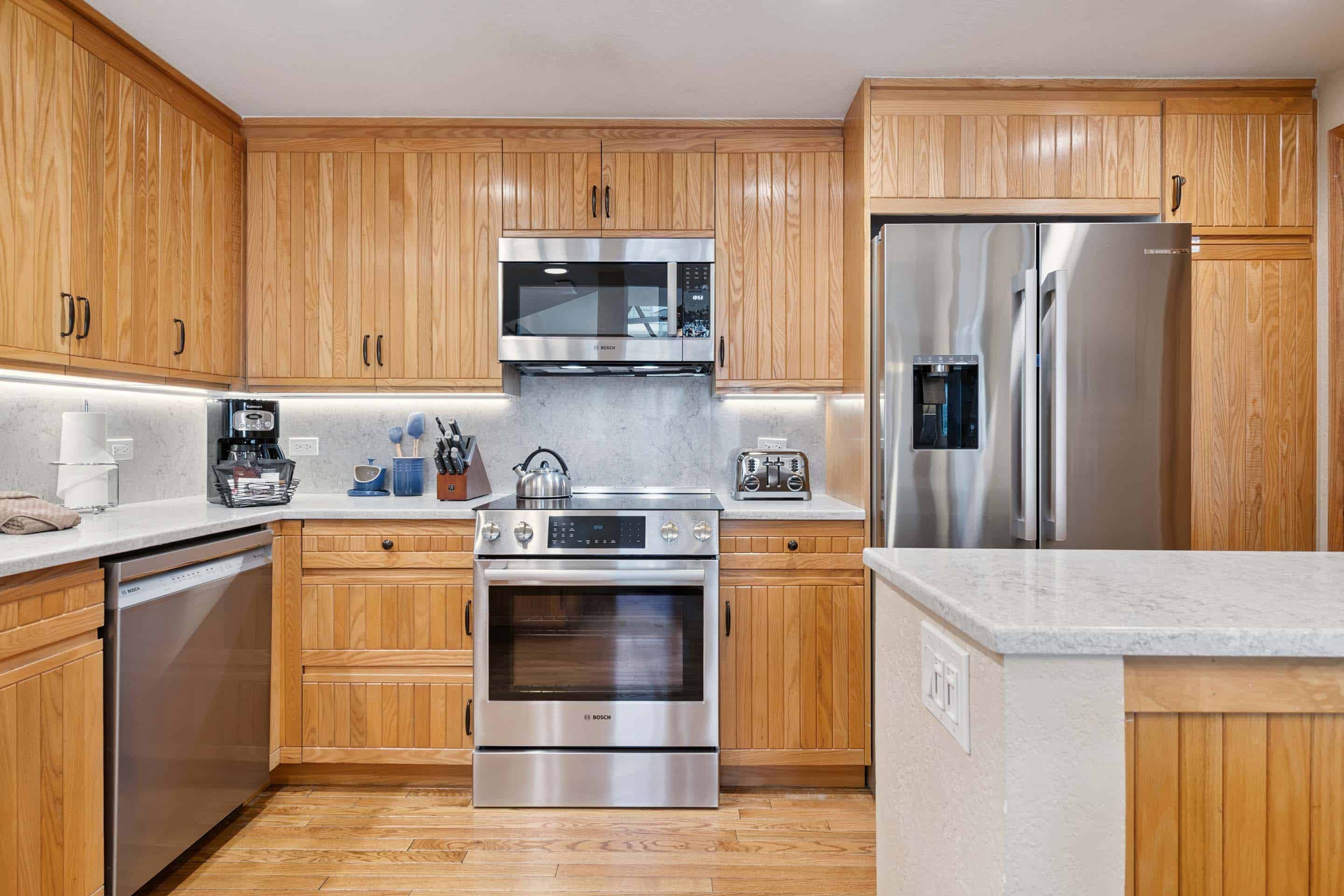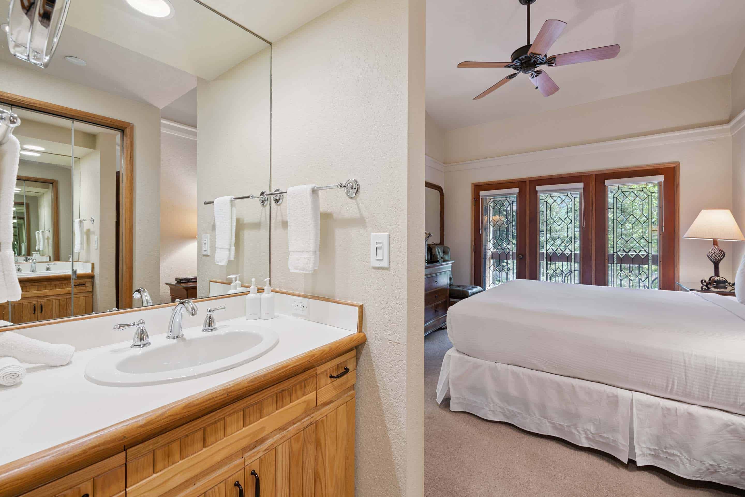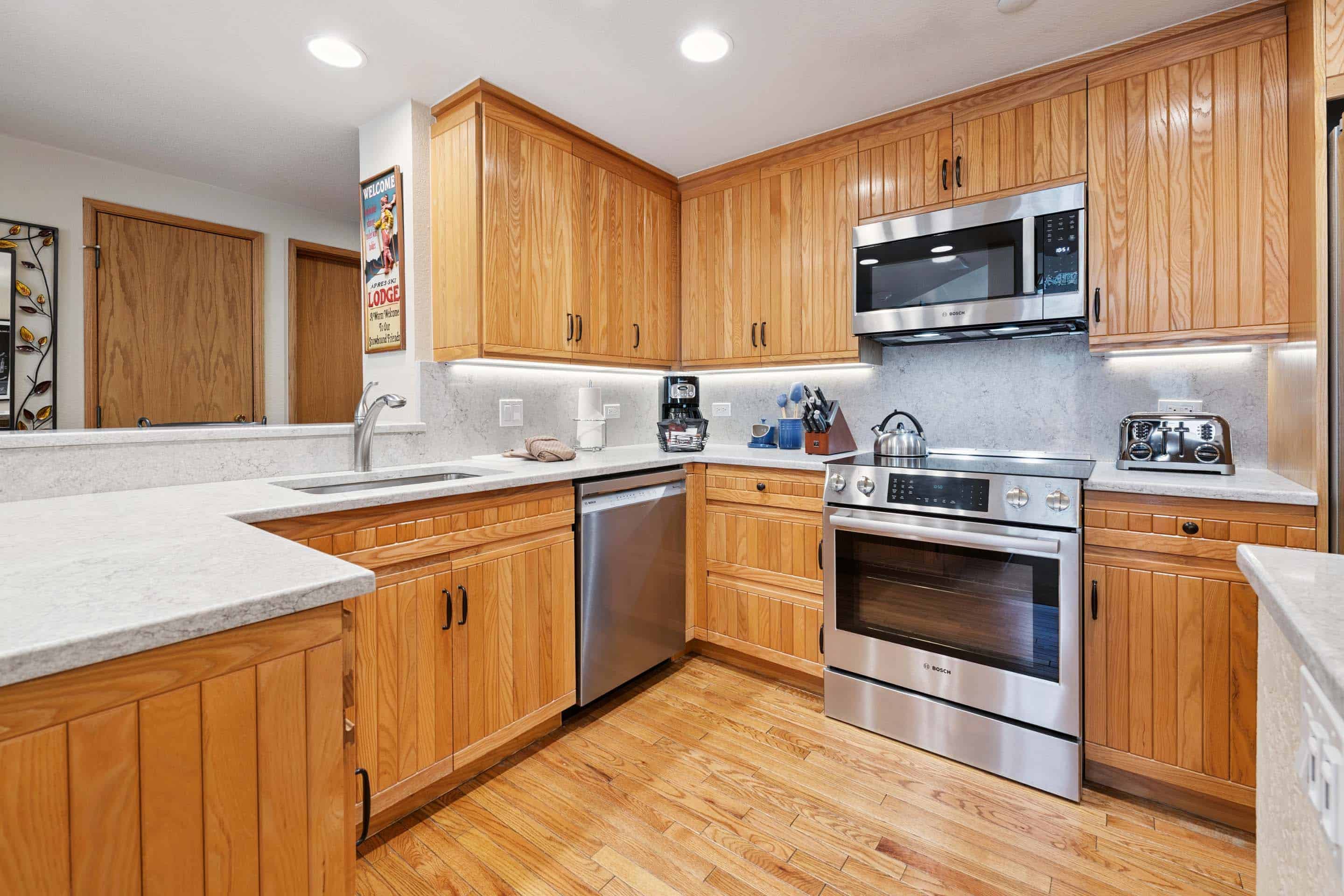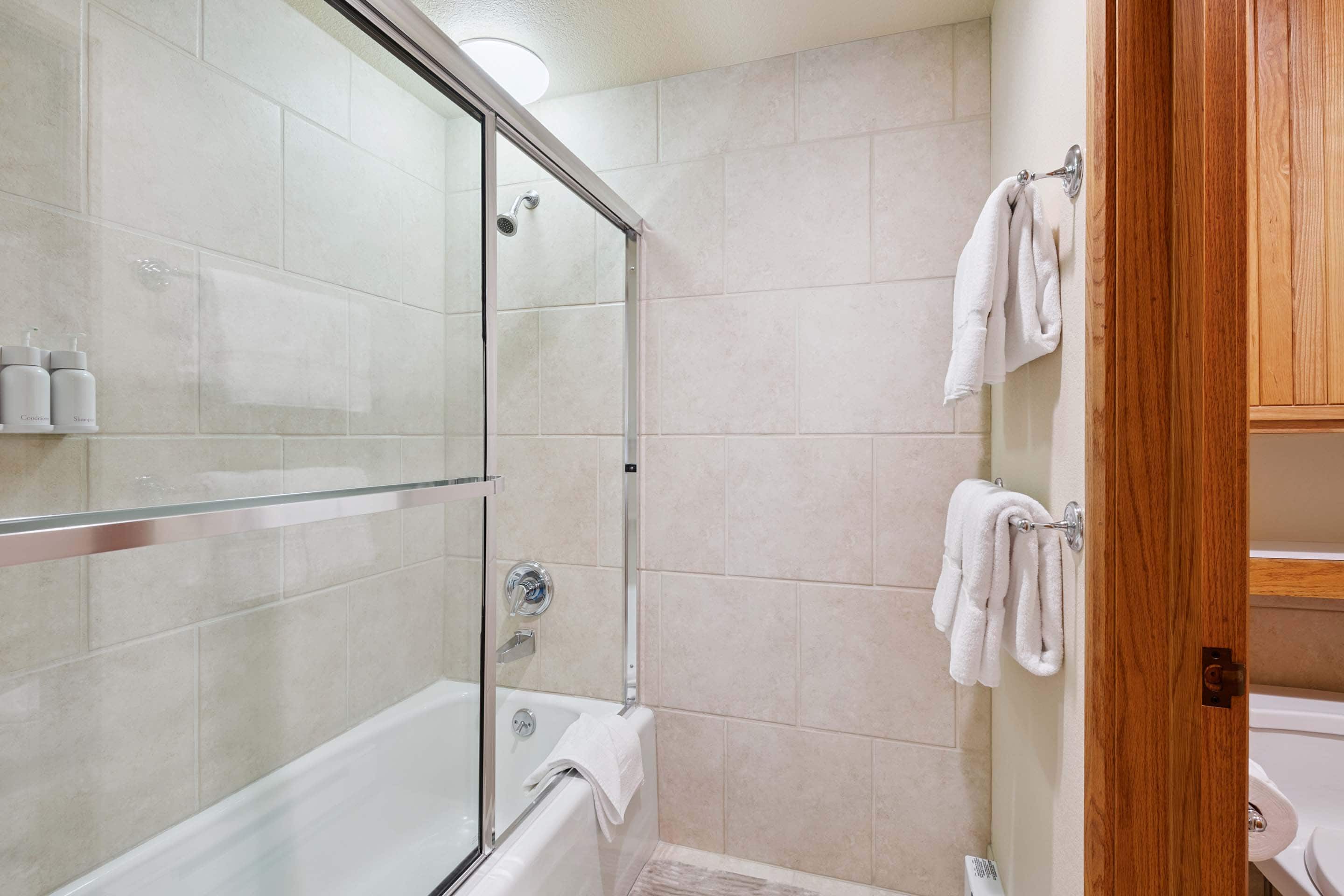 This ski-in, ski-out, two-bedroom residence sleeps eight, offering a family room with vaulted ceilings, a sleeper sofa, full kitchen, and dining niche. Additional features include two guest suites, each with an attached bathroom (one with a king size bed, the second with two queen beds), a private deck, washer/dryer and garage parking.
